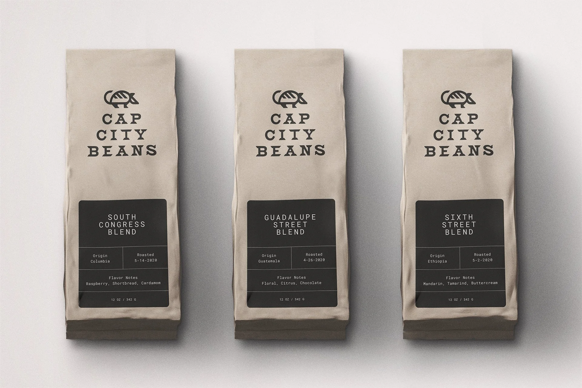 Cap City BeansAustin based coffee company. Location AUSTIN, TX Services Brand Identity PACKAGING Typography